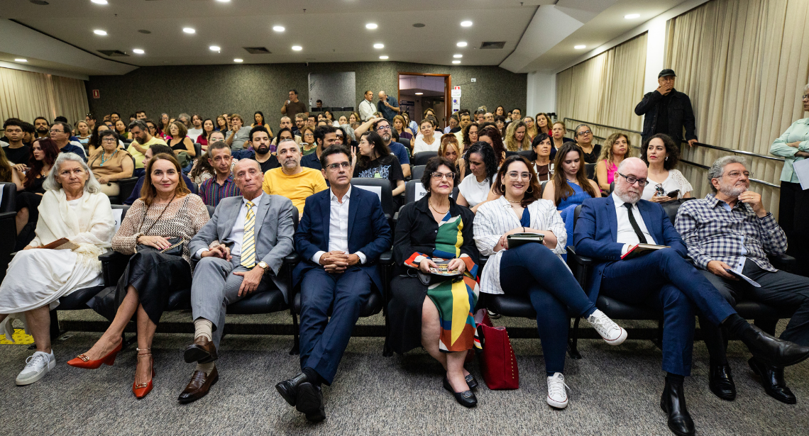 Fotografia em plano aberto mostra um auditório cheio, com dezenas de pessoas sentadas em cadeiras dispostas em fileiras. Em primeiro plano, na fileira da frente, estão homens e mulheres trajando roupas formais e sociais, como ternos, vestidos e blazers, sentados lado a lado e voltados para a frente, em direção ao palco (não visível na imagem). Ao fundo, o restante do público ocupa praticamente todos os assentos, formando um ambiente lotado. A sala possui iluminação embutida no teto, paredes em tons neutros e cortinas claras na lateral direita. O clima é de atenção e concentração durante a atividade.