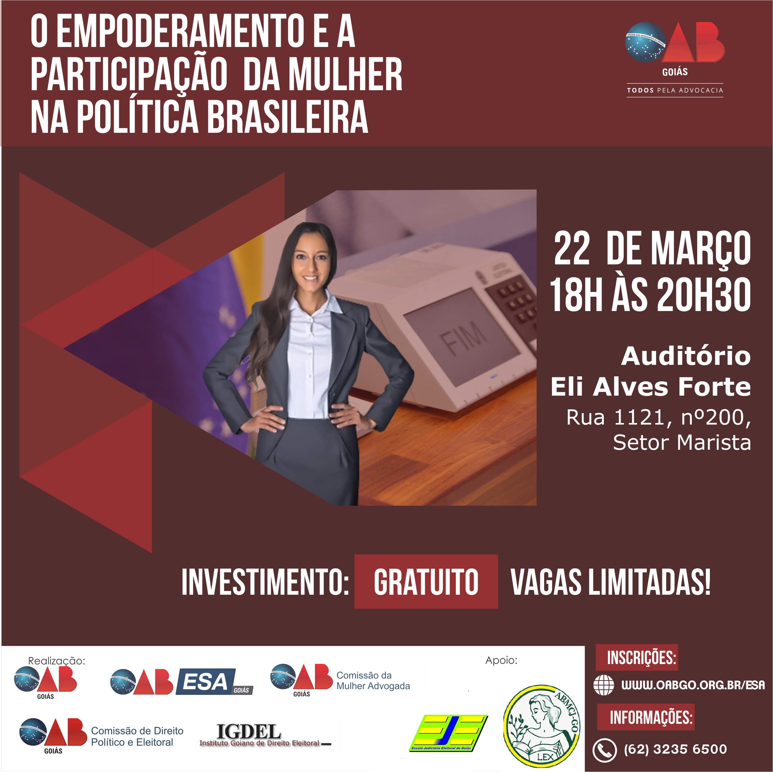 A EJE/GO apoiou o evento "O empoderamento e a participação da mulher na política brasileira" feito pela OAB Goiás. Com inscrições gratuitas e vagas limitadas, realizou-se no dia 22 de março de 2018 a partir das 18h no Auditório Eli Alves Forte.
